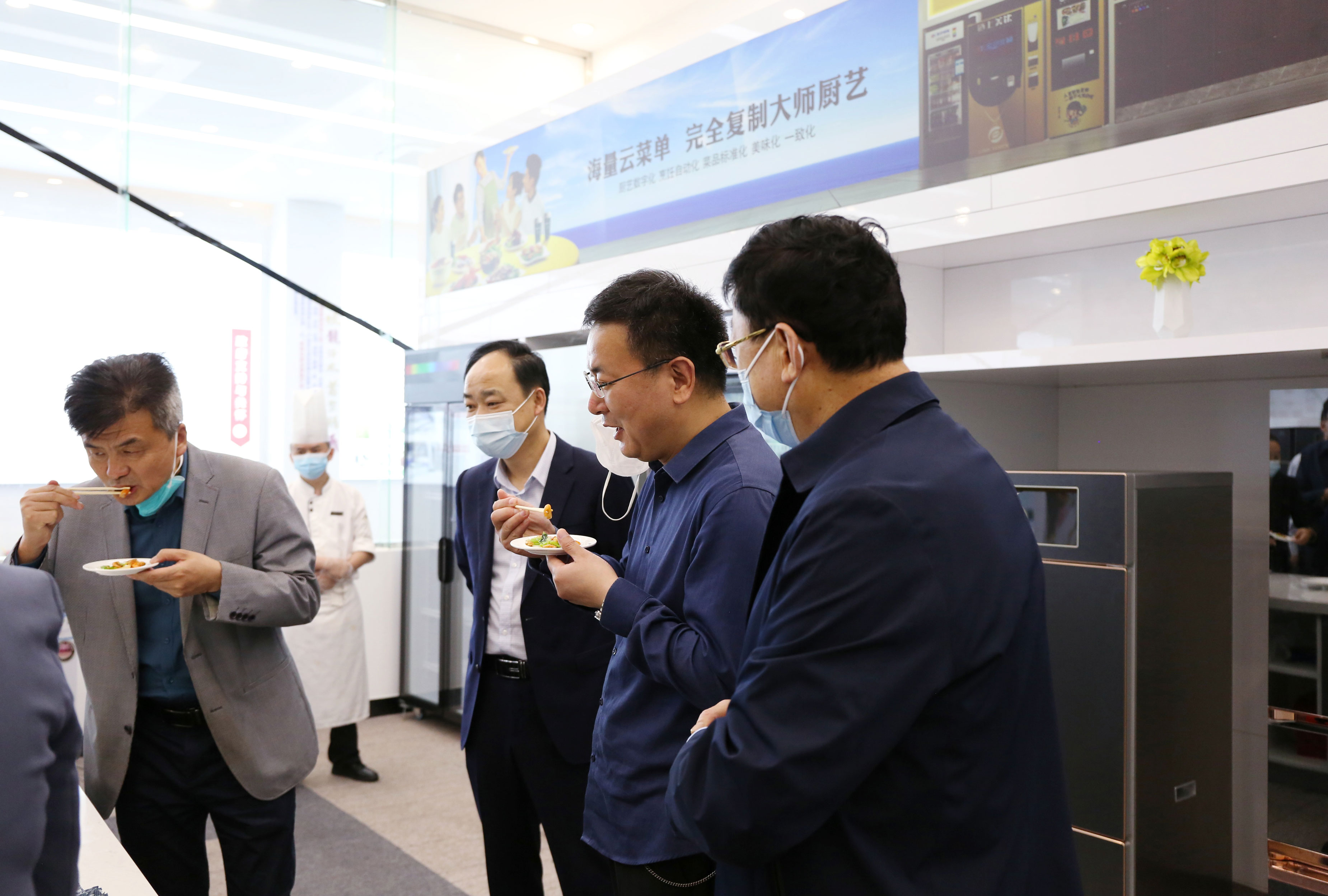 接著,黃院長一行又來到公司的產品展示廳和轉型展示廳。集團公司董事長助理倪曙東向黃院長一行重點介紹了索伊集團的發展歷程。他聽后對索伊創新發展的路徑大為贊賞,對精準總結智能制造餐飲行業發展“八化”趨勢給予充分肯定。在中央廚房的體驗廳,現場觀看了無油煙、無明火、無污染、快捷環保的廚神和野牛機器人分別炒制的蔥爆河蝦和黑椒牛肉粒炒制過程。當黃院長一行品嘗菜品后更是贊不絕口,他深有感觸地說:“色香味俱全,口感很好,肉嫩細滑、咸淡精確適宜,很好吃。”這臺野牛炒菜機器人,值得在學校食堂推廣使用,我希望以后我們有合作的機會?!?/span>