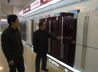 索伊黨建指導(dǎo)員李忠(圖右)向王源成書記(圖左)介紹索伊冰箱
