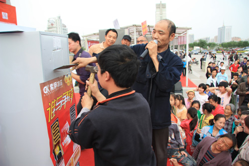 索伊員工現場鑿機向消費者證明貨真價實的“精銅管”冷藏蒸發器和回氣管路