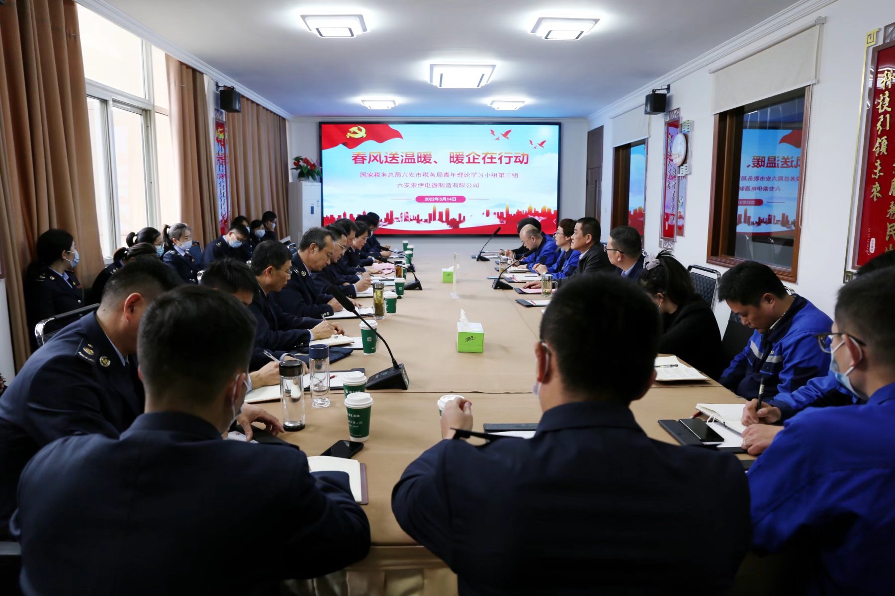 2022年3月14日下午,國家稅務(wù)總局六安市稅務(wù)局青年理論學(xué)習(xí)小組第三組“暖企行動(dòng)”暨中共國家稅務(wù)總局六安市稅務(wù)第一稽查局、第二稽查局支部委員會(huì)主題黨日活動(dòng)在六安索伊電器公司舉行。六安索伊電器制造有限公司董事長王瓊峰、黨委書記汪顯華及六個(gè)基層黨支部的部分青年黨員代表共同參加此項(xiàng)活動(dòng)。